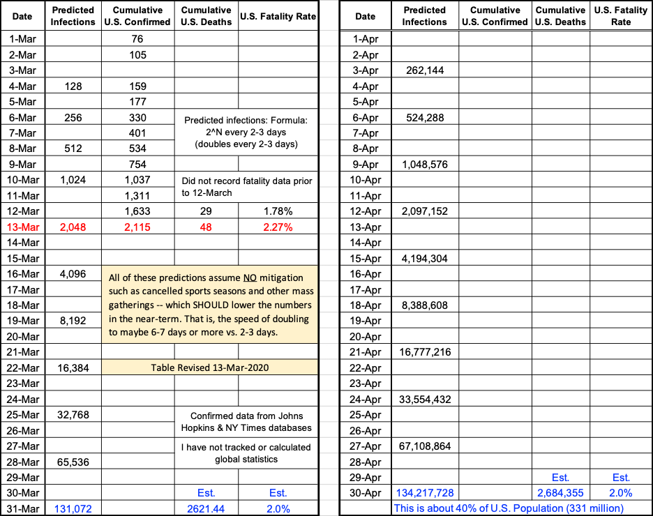 Yeah, the numbers are growing and seem to match predicted values (so far). This revised data actually shows an increased doubling-rate when compared the previous table (post #2). However, as noted in the table, these statistics do NOT include any mitigation measures such as cancelled sports seasons, closed schools, closed theaters etc., to say nothing of people just staying home. Hopefully these measure will help to significantly reduce the rate of growth – which would lower the demand on healthcare resource, which in turn should reduce the number of deaths. On the other hand — a reduced rate does not mean that the virus spread will not result in the same total number of cases and fatalities. We can still expect 20% – 40% (60 – 100 million) people to get the disease – just at a more leisurely pace, say over a period of years.