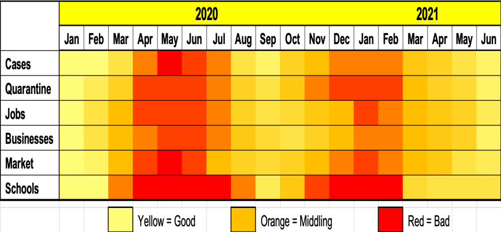 This image looks like one of those pictures you’re supposed to stare at and see Abe Lincoln or the Mona Lisa or a cat. It’s sort of like that – at least the staring part. There a number of things to notice. The columns cover the next year or so month by month. The rows illustrate measures for different categories; where yellow is “good,” orange is “okay,” and red is “bad.” These colors are intended to reflect trends and predictions based on the limited data acquired to date. Together the rows and columns attempt to paint a picture of how the future may unfold.