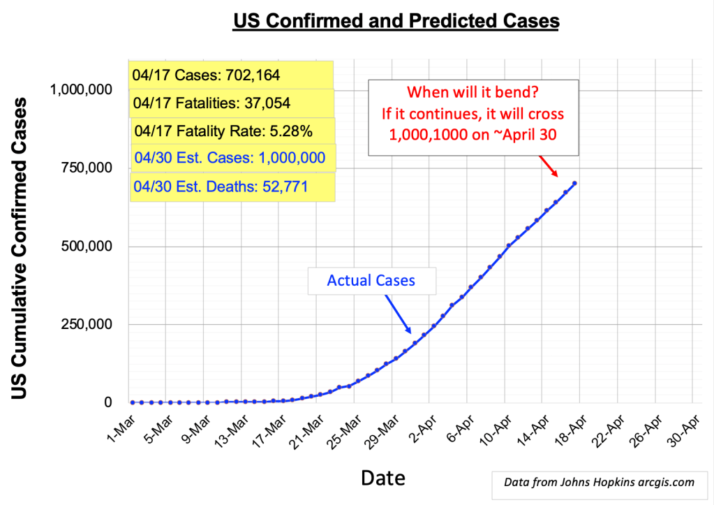 The number of confirmed U.S. cases currently exceeds 700,000. Here’s the question: Will the upward trend continue to 1,000,000 by April 30, or will a bend begin to appear before then. “THERE IS AS YET INSUFFICIENT DATA FOR A MEANINGFUL ANSWER,” [MultiVac, “The Last Question,” Isaac Asimov, Science Fiction Quarterly, November 1956]. Current estimated fatality rate is about 5.28%, corresponding to over 50,000 deaths by April 30. The fatality rate continues to increase every week. This is unexpected. Reason is unclear at this time [See, MultiVac].