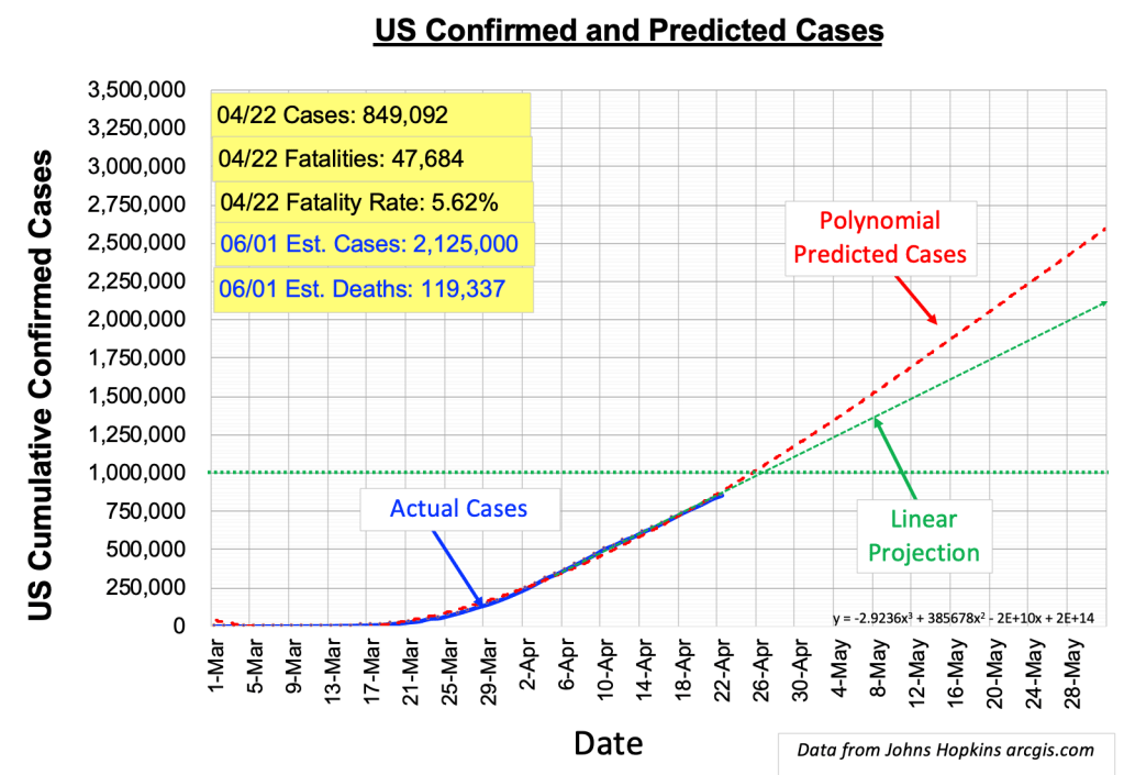 The number of confirmed U.S. cases currently nears 850,000. We credit Joe in California with noticing that the trend curve is no longer a curve but is in fact a line. This linear projection is a good thing – it means the number of cases is no longer accelerating. That is, the number of confirmed cases each day is about the same (currently about 30,000). I also noticed this, right after Joe pointed it out! Thanks, Joe. 😉 This leveling-out may be a function of the current average of 150,000 tests per day. The linear projection shows ~1,000,000 confirmed cases by April 27. Current estimated fatality rate is about 5.62%, corresponding to over 100,000 deaths by May 31. The fatality rate continues to increase every week. The reason is unclear at this time though may be attributed to significant under-count of confirmed cases. We’ll keep a close eye on this. — Thanks also to Kepler’s Ghost on the other coast who prepared several alternate trend curves long ago (weeks!) when the curve was still a curve. Hopefully we will have no further need of his techniques — though I fear that sometime this Fall when Covid resurges Joe’s line may very well revert to one of the Ghost’s curves.