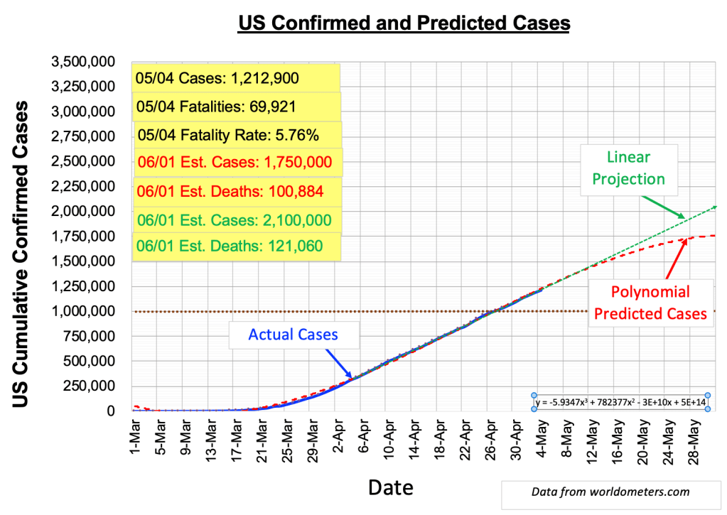The green projection continues on upward as expected when nothing changes in terms of mitigation. Meanwhile the red dotted curve tends toward a slowdown. Although both curves are essentially the same at the moment we might expect the green line to be more likely given the many states relaxing social distancing guidelines. This projection indicates about 120,000 deaths by June 1. Current government projections, updated to reflect the impact of the country “opening up,” indicate ~200,000 new cases per day (yes, 200,000 per day) and ~3,000 deaths per day by June 1. Editorial comment: ☹️