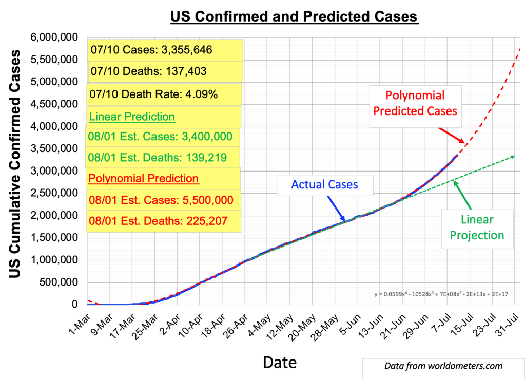 Green-dashed curve good. Red-dashed curve bad. Really bad. And sad. We are back in exponential growth territory, where we when all this started in March. While we could discuss all the reasons for this dire situation, let’s leave that to Dr. Fauci and the vast unavoidable array of doctors and epidemiologists (and, sigh, politicians) who bombard us daily. For our purposes the data is what the data is. The red-dashed trend curve above projects a total of 5,500,000 cases by August 1. This is greater than projections from IHME and other sophisticated university and government models.